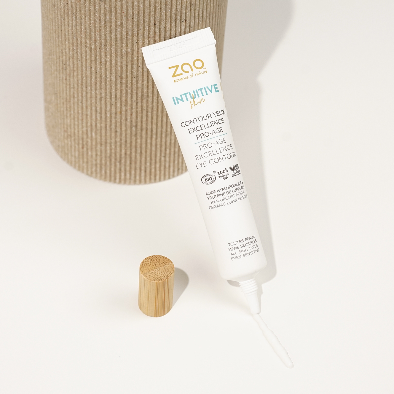 Deze verzorging is speciaal ontwikkeld voor het delicate oogcontour. Het combineert twee krachtige actieve ingrediënten: plantaardig hyaluronzuur, bekend om zijn hydraterende en opvullende eigenschappen, en biologisch lupineproteïne, met zijn verstevigende eigenschappen. De rijke formule, dat ook biologisch korenbloemhydrolaat, cafeïne en extracten van rode algen bevat, helpt vocht en vermoeidheidstekenen rond de ogen te verminderen. Fijne lijntjes en rimpels worden gladder. Dankzij de zachte, smeltende textuur voelt het product direct na het aanbrengen comfortabel en fris aan. De ogen zien er meer uitgerust uit en de huid is glad, gehydrateerd en zichtbaar gerevitaliseerd.